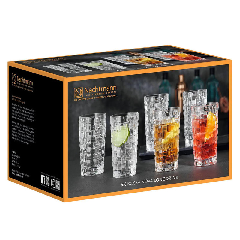 لیوان 6 پارچه ناخمن مدل Nachtmann Bossa Nova long drink glass ساخته شده از کریستال سرب که تضمین می کند در طول زمان درخشندگی خود را حفظ می کند . این مجموعه شامل 6 عدد لیوان با طول و عرض 8 سانتی متر و ارتفاع 15 سانتی متر و وزن هر لیوان 540 گرم می باشد که نشان از اصالت جنس کریستال است . طرح بافت این مدل چشم نواز و زیبا می باشد .