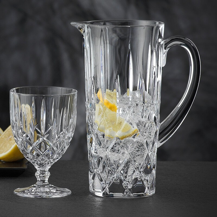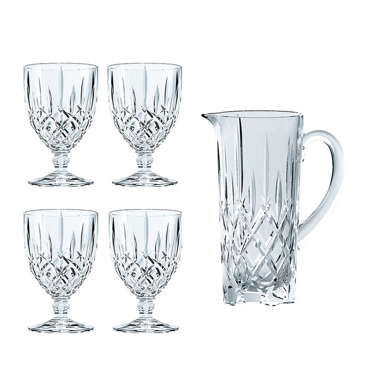 پارچ و لیوان 5 پارچه ناخمن مدل Nachtmann Noblesse ساخته شده از کریستال که تضمین می کند در طول زمان درخشندگی خود را حفظ می کند . این مجموعه شامل 1 عدد پارچ به طول و عرض 11 سانتی متر و ارتفاع 23 سانتی متر و وزن 1550 گرم به همراه 4 عدد لیوان با طول و عرض 9 سانتی متر و ارتفاع 14 سانتی متر و وزن 350 گرم می باشد . طرح تیز و کشیده مدل نابلس جاودانه است .