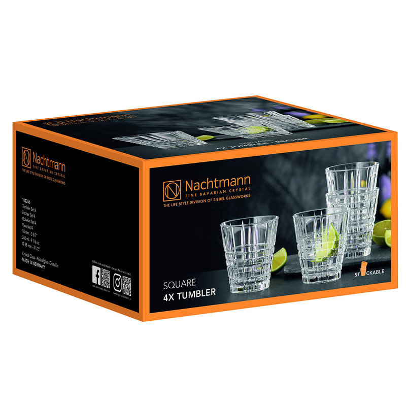 لیوان 4 پارچه ناخمن مدل Nachtmann Square ساخته شده از کریستال بدون سرب که تضمین می کند در طول زمان درخشندگی خود را حفظ می کند . این مجموعه شامل 4 عدد لیوان با طول و عرض 8.5 سانتی متر و ارتفاع 9.5 سانتی متر و وزن هر عدد 280 گرم می باشد .