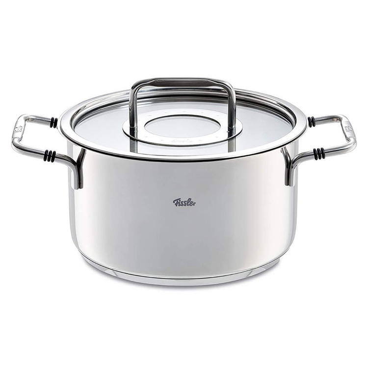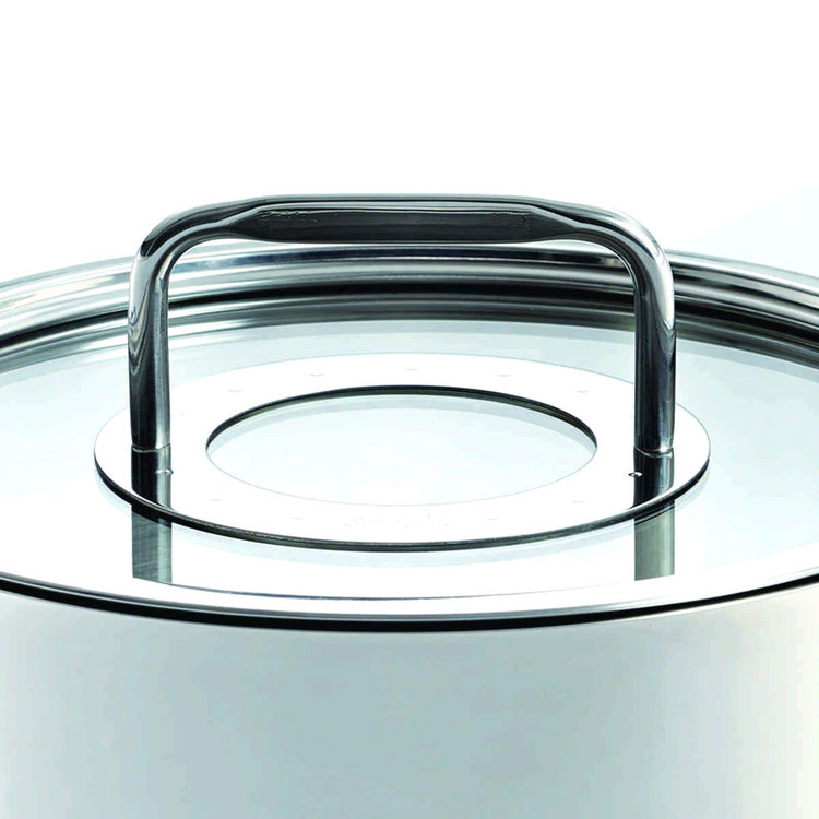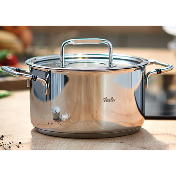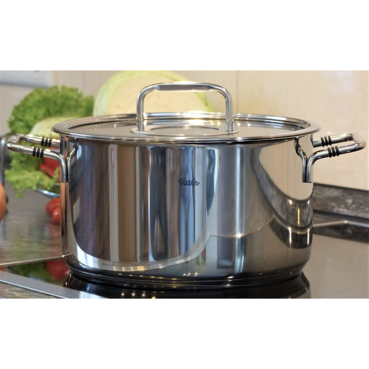 قابلمه 24 سانت فیسلر مدل FISSLER BONN با درب استیل و شیشه و طراحی زیبا و ساخته شده در کشور آلمان آشپزی را آسان تر می کند . لبه های پهن قابلمه باعث می شود هنگام خالی کردن آن قطره ای آب بیرون نریزد . این سری قابلمه برای انواع اجاق گاز از جمله القایی مناسب است . کف سه لایه با توزیع یکنواخت گرما و ذخیره گرما برای صرف جویی در مصرف می باشد . جنس استیل ضد زنگ 18/10 قابل شستشو در ماشین ظرفشویی ، تمیز کردن آسان ، ایمن در فر ، بی مزه ( مزه غذا در این قابلمه ها تغییر نمی کند ) و مقاوم در برابر اسید می باشد .