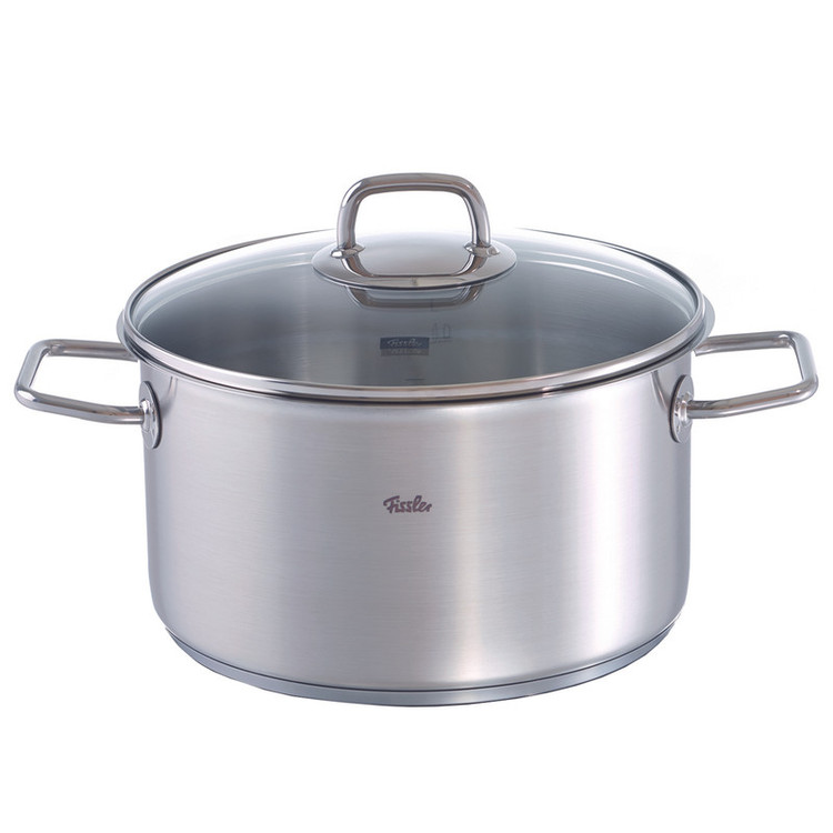 قابلمه 20 سانت فیسلر مدل Fissler Viseo With Glass با درب استیل و شیشه و ظرفیت 3.6 لیتر با طراحی زیبا آشپزی را آسان تر می کند . لبه های پهن قابلمه باعث می شود هنگام خالی کردن آن قطره ای آب بیرون نریزد . این سری قابلمه برای انواع اجاق گاز از جمله القایی مناسب است . کف سه لایه با توزیع یکنواخت گرما و ذخیره گرما برای صرف جویی در مصرف می باشد . جنس استیل ضد زنگ 18/10 قابل شستشو در ماشین ظرفشویی ، تمیز کردن آسان ، ایمن در فر ، بی مزه ( مزه غذا در این قابلمه ها تغییر نمی کند ) و مقاوم در برابر اسید می باشد .