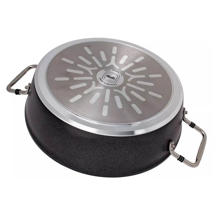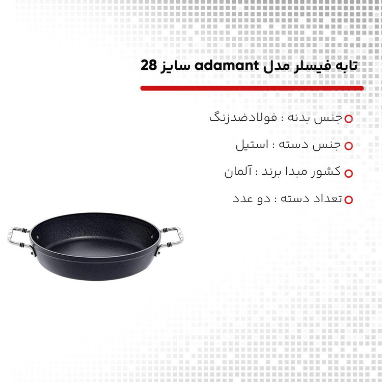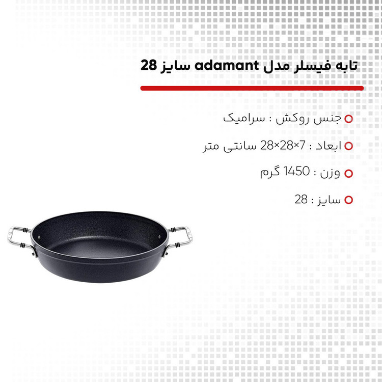 تابه 28 سانت فیسلر مدل FISSLER FISSLER adamant Servierpfanne با روکش نچسب فاقد مواد شیمیایی که برای سلامت شما هیچگونه ضرر و زیانی ندارند . غذای سرخ شده و یا پخته در بین ماهیتابه ها ، نباید در هیچ آشپزخانه ای از قلم بیفتد ، چه آماتور و چه آشپز حرفه ای ، چه تخم مرغ سرخ شده با بیکن و چه غذاهای تند . محدوده تابه های FISSLER مدل مناسبی را برای هر ظرف ، هر ماده و هر نوع آماده سازی ارائه می دهد . جنس فولاد ضد زنگ با کیفیت بالا مقاوم در برابر حرارت . همه ماهیتابه های دسته بلند مجهز به دسته ارگونومیک هستند به طوری که راحت در دست می نشینند . پایه جهانی TransTherm® مناسب همه انواع اجاق گاز از جمله القایی است . مواد بکار رفته در تابه فیسلر بدون عارضه هستند ، زنگ نمی زنند و همچنین در مصرف انرژی صرفه جویی می کنند .