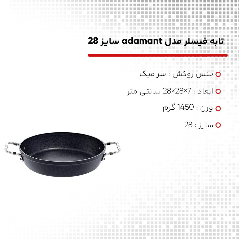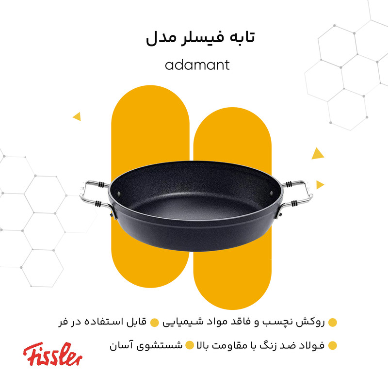 تابه 28 سانت فیسلر مدل FISSLER FISSLER adamant Servierpfanne با روکش نچسب فاقد مواد شیمیایی که برای سلامت شما هیچگونه ضرر و زیانی ندارند . غذای سرخ شده و یا پخته در بین ماهیتابه ها ، نباید در هیچ آشپزخانه ای از قلم بیفتد ، چه آماتور و چه آشپز حرفه ای ، چه تخم مرغ سرخ شده با بیکن و چه غذاهای تند . محدوده تابه های FISSLER مدل مناسبی را برای هر ظرف ، هر ماده و هر نوع آماده سازی ارائه می دهد . جنس فولاد ضد زنگ با کیفیت بالا مقاوم در برابر حرارت . همه ماهیتابه های دسته بلند مجهز به دسته ارگونومیک هستند به طوری که راحت در دست می نشینند . پایه جهانی TransTherm® مناسب همه انواع اجاق گاز از جمله القایی است . مواد بکار رفته در تابه فیسلر بدون عارضه هستند ، زنگ نمی زنند و همچنین در مصرف انرژی صرفه جویی می کنند .