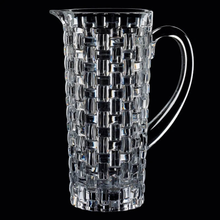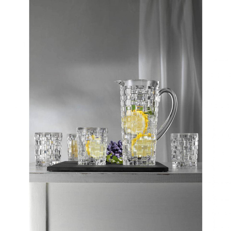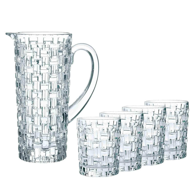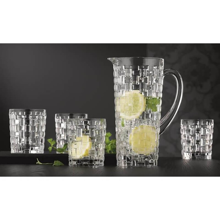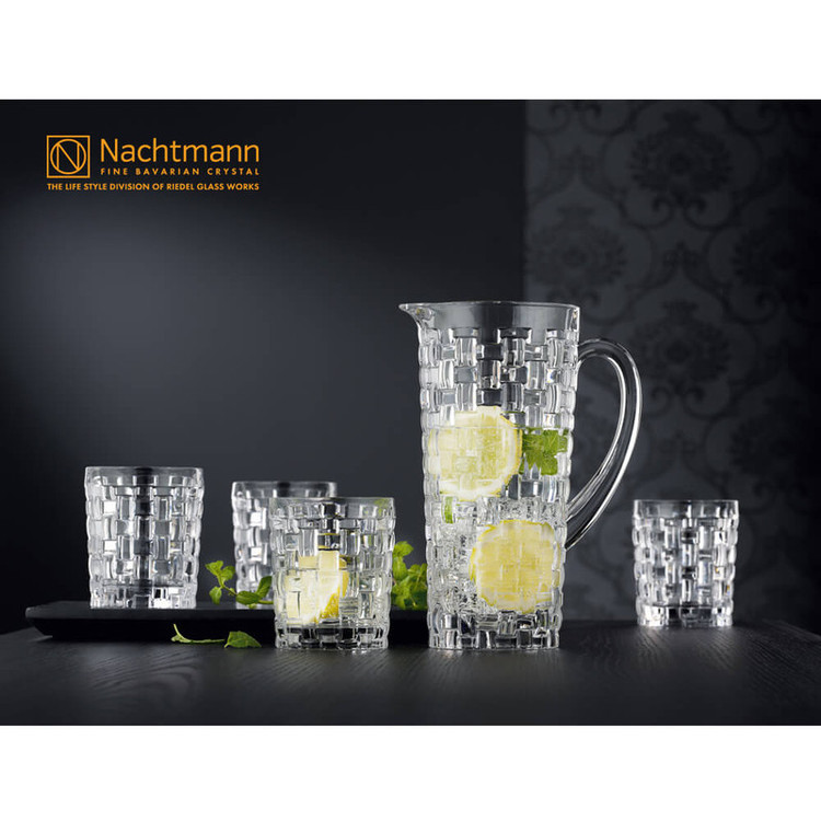 پارچ و لیوان ناخمن مدل Nachtmann Bossa Nova Karaf met Glazen ساخته شده از کریستال سرب که تضمین می کند در طول زمان درخشندگی خود را حفظ می کند . این مجموعه شامل 1 عدد پارچ به طول و عرض 11 سانتی متر و ارتفاع 23 سانتی متر و وزن 1500 گرم به همراه 4 عدد لیوان با طول و عرض 8 سانتی متر و ارتفاع 10 سانتی متر و وزن 400 گرم می باشد . طرح بافت این مدل چشم نواز و زیبا می باشد .