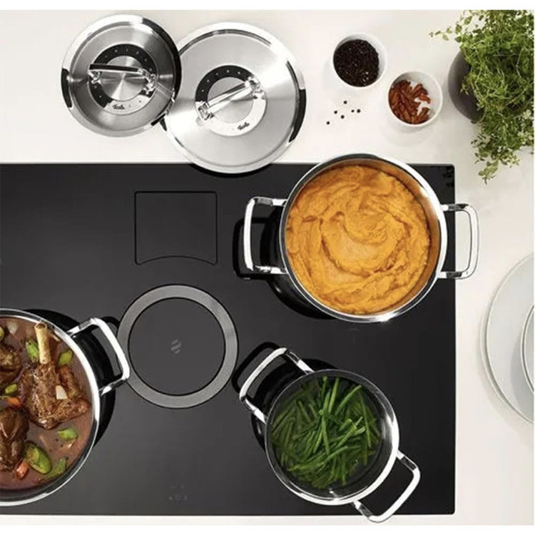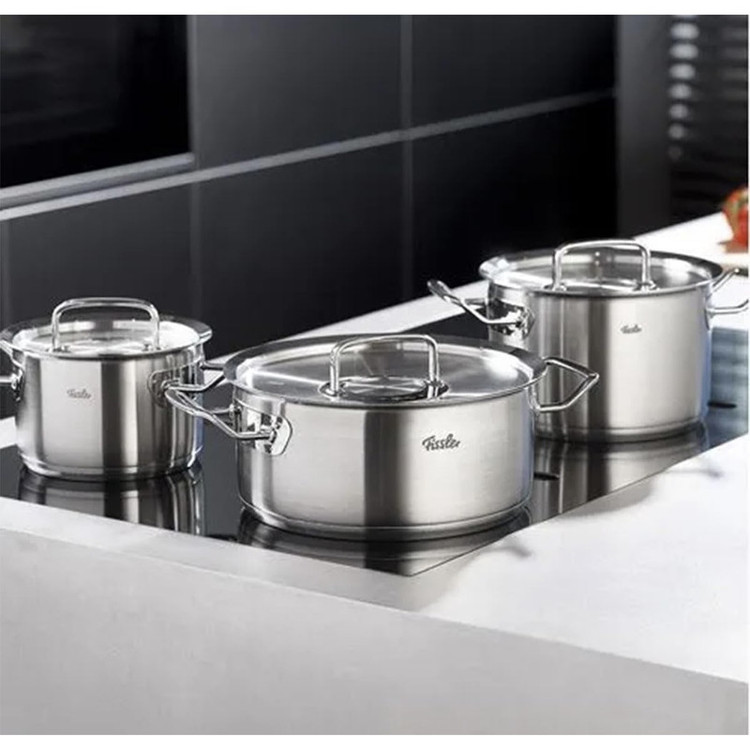سرویس قابلمه فیسلر مدل پروفی کالکشن که جنس بدنه ی آن از فولاد ضدزنگ میباشد. این ظروف دوام بسیار بالایی دارند و مناسب استفاده در فر تا دمای ۴۵۰ درجه ی فارنهایت میباشند. همچنین مناسب استفاده بر روی انواع اجاق ها از جمله القای و ... را دارند در با تکنولوژی heavy condensate plus برای طعم بهتر و غذاهای ابدارتر میباشد مدل پروفی،بالاترین مدل از ساخته های برند فیسلر المان میباشد. دسته ی قابلمه در طول پخت و پز داغ نمیشود سطح قابلمه ها صاف،ضد زنگ و خط و خش میباشند و همچنین دواره ی داخل قابلمه،برای سهولت در استفاده مدرج است. اقلام موجود در سرویس:قابلمه سايز ۲۰ بلند-قابلمه سايز ۲۰ کوتاه-قابلمه سايز ۱۶-قابلمه سايز ۲۴ و شیرجوش سايز ۱۶