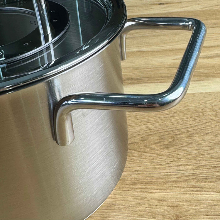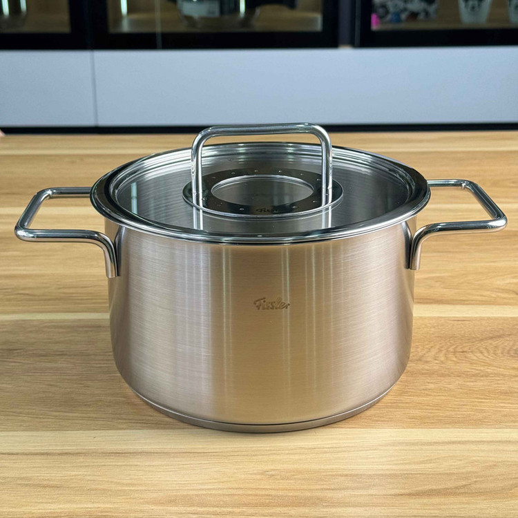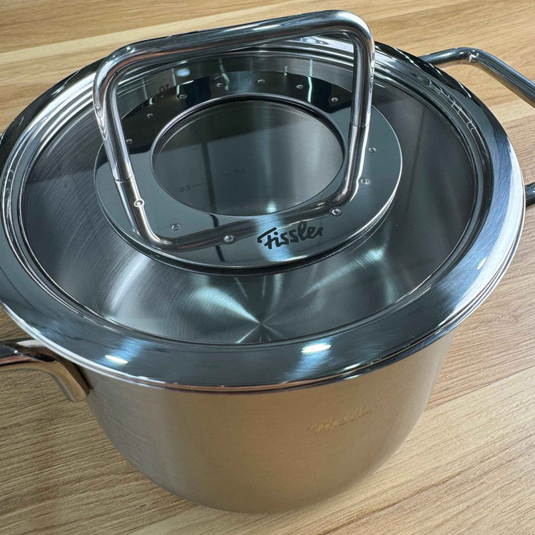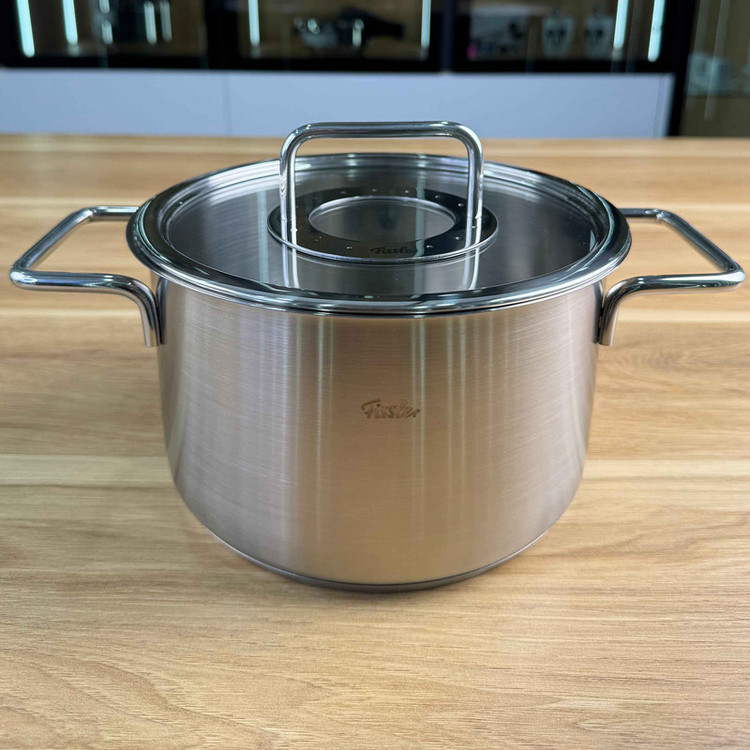 سرویس قابلمه 9 پارچه فیسلر مدل FISSLER PURE از 8 قطعه ساخته شده از استیل 18/10 و درب آن از شیشه و استیل است همچنین دسته های قابلمه در طول پخت و پز داغ نمی شوند . کف سه لایه جهانی ثبت شده TransTherm به لطف توزیع و حفظ بهینه گرما ، هنگام پخت و پز در مصرف انرژی صرفه جویی می کند . سطح فوق العاده صاف و فوق العاده سخت در برابر خراش و خط ، بنابراین به راحتی تمیز می شود و همیشه ظاهر آن جدید است . این سرویس ، یک قابلمه با سایز 24 سانت و حجم 5.1 لیتر ، قابلمه 20 سانت بلند با حجم 3.2 لیتر ، قابلمه 20 سانت کوتاه با حجم 2.3 لیتر و قابلمه 16 سانت با حجم 1.9 لیتر می باشد . درب این سرویس از جنس پیرکس و استیل می باشد . این سرویس قابل استفاده در اجاق های القایی و برقی می باشد و از بروز ترین و با کیفیت ترین متریال ها برای ساخت آن استفاده شده است .