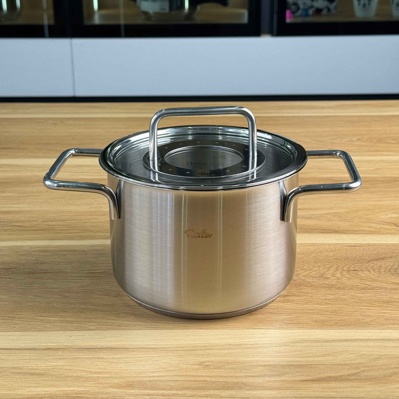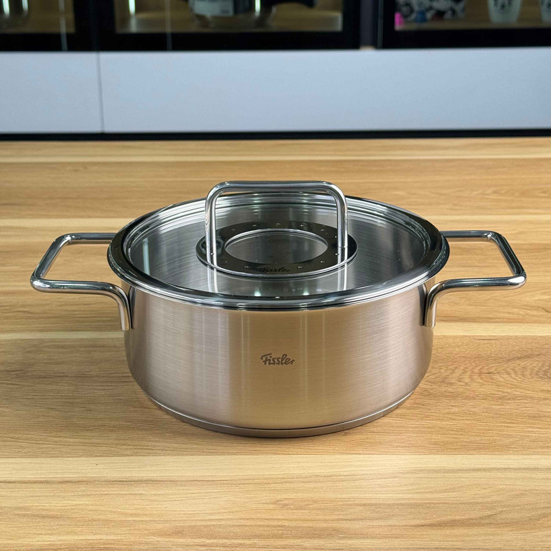سرویس قابلمه 9 پارچه فیسلر مدل FISSLER PURE از 8 قطعه ساخته شده از استیل 18/10 و درب آن از شیشه و استیل است همچنین دسته های قابلمه در طول پخت و پز داغ نمی شوند . کف سه لایه جهانی ثبت شده TransTherm به لطف توزیع و حفظ بهینه گرما ، هنگام پخت و پز در مصرف انرژی صرفه جویی می کند . سطح فوق العاده صاف و فوق العاده سخت در برابر خراش و خط ، بنابراین به راحتی تمیز می شود و همیشه ظاهر آن جدید است . این سرویس ، یک قابلمه با سایز 24 سانت و حجم 5.1 لیتر ، قابلمه 20 سانت بلند با حجم 3.2 لیتر ، قابلمه 20 سانت کوتاه با حجم 2.3 لیتر و قابلمه 16 سانت با حجم 1.9 لیتر می باشد . درب این سرویس از جنس پیرکس و استیل می باشد . این سرویس قابل استفاده در اجاق های القایی و برقی می باشد و از بروز ترین و با کیفیت ترین متریال ها برای ساخت آن استفاده شده است .